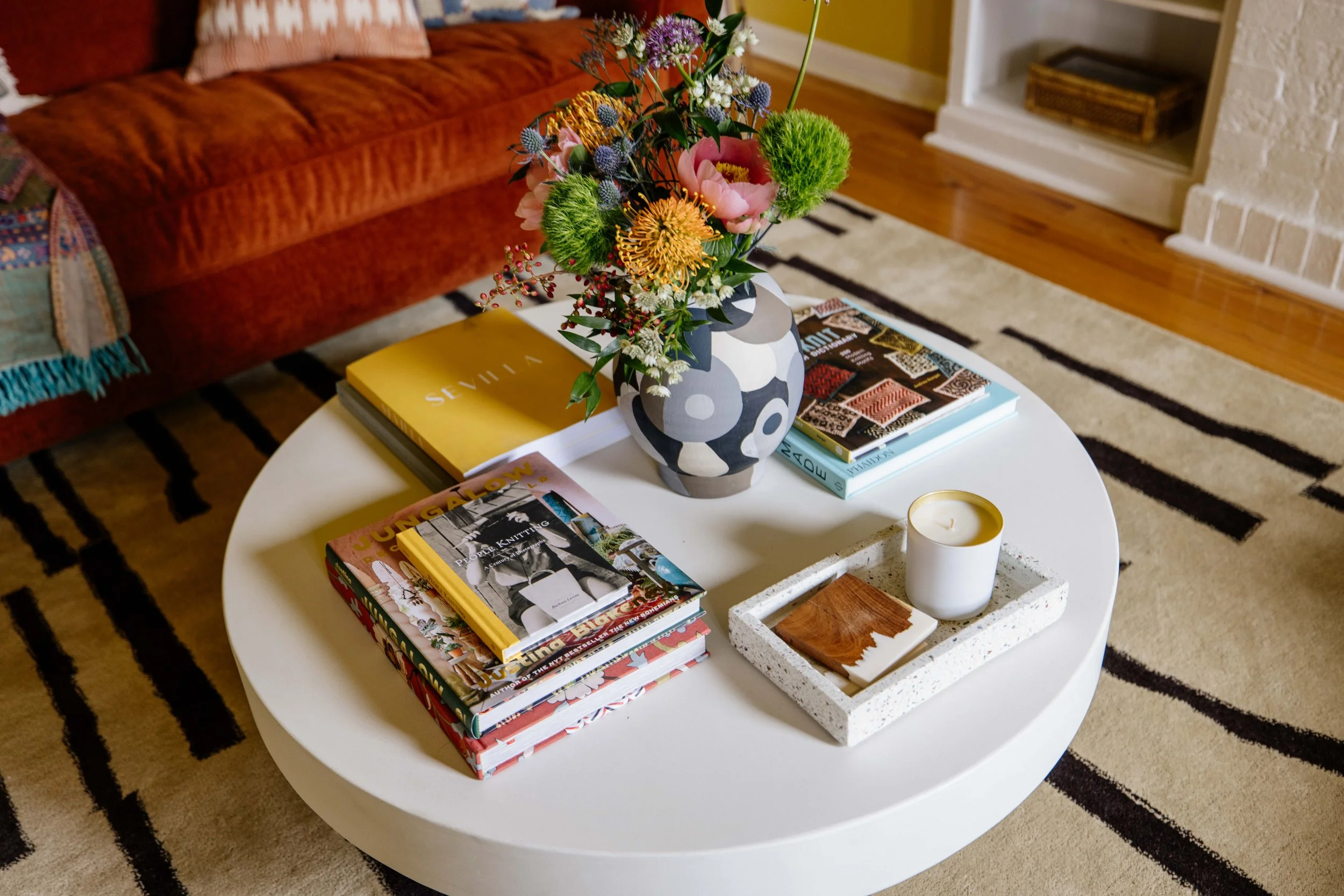 Mix in wood, woven textures (knits, throws, and pillows), and ceramics to add warmth to a space. Here we picked a tripod wooden floor lamp, pillows with woven touches in warm hues, and also a painted ceramic vase to give it a handmade touch.