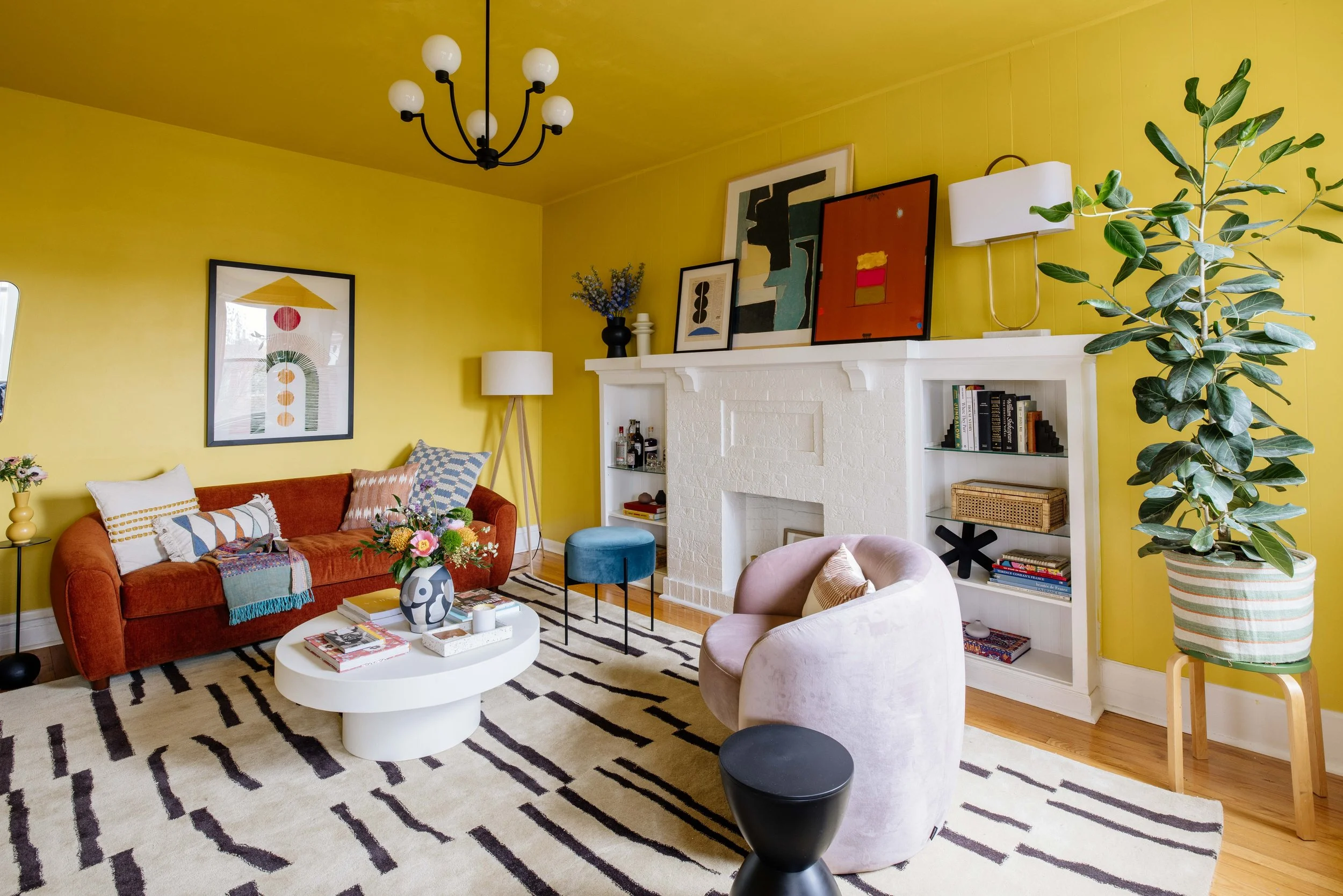 Since we painted the walls and ceiling a vibrant color, we chose a more neutral rug to balance it out. It’s like the color of sand. And this rug with black lines adds enough visual interest without competing with the walls. So just imagine yourself at the beach with this bright yellow warm sun shining above and soft sand under your feet.