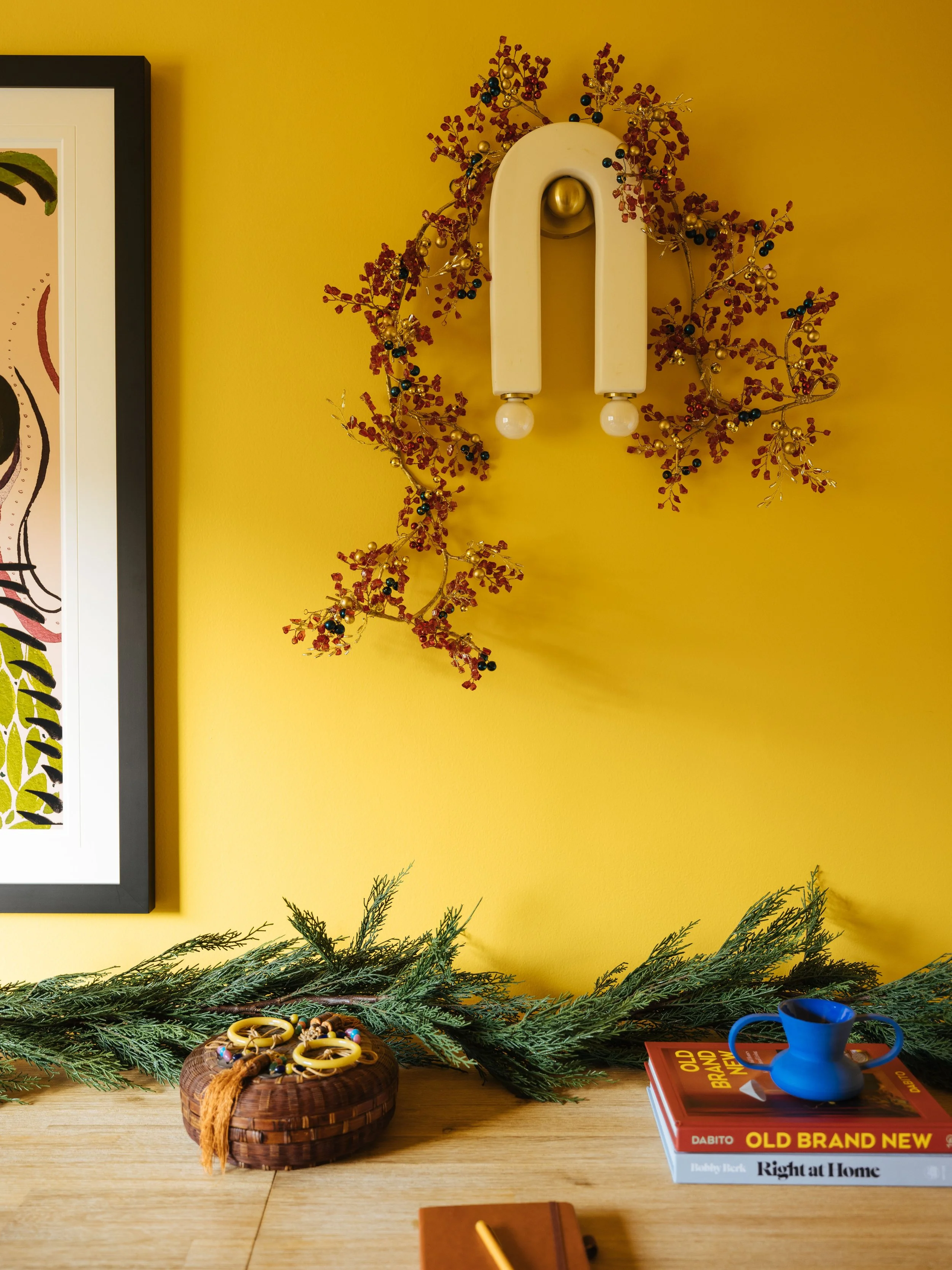Lighting plays a crucial role in holiday decor as it sets the mood and creates ambiance. Mitzi is where I find thoughtfully crafted lighting to enhance the overall festive vibe. My collection with Mitzi is super versatile and will help you layer different lighting options to work with any design style, especially during the holiday season. They add a bit of sculptural interest and dimension to a space. It can be a bit stressful around this time of year so I like to keep my holiday decor really easy. I know lighting can be intimidating but Mitzi makes it fun and simple with their helpful tips and support from their design experts. They have a wide selection of fixtures to choose from to match your style. Once you pick out your high quality lights, you can hang a garland on a sconce or a sparkly tassel ornament on a lamp, like I did here to add a touch of warm, holiday cheer.