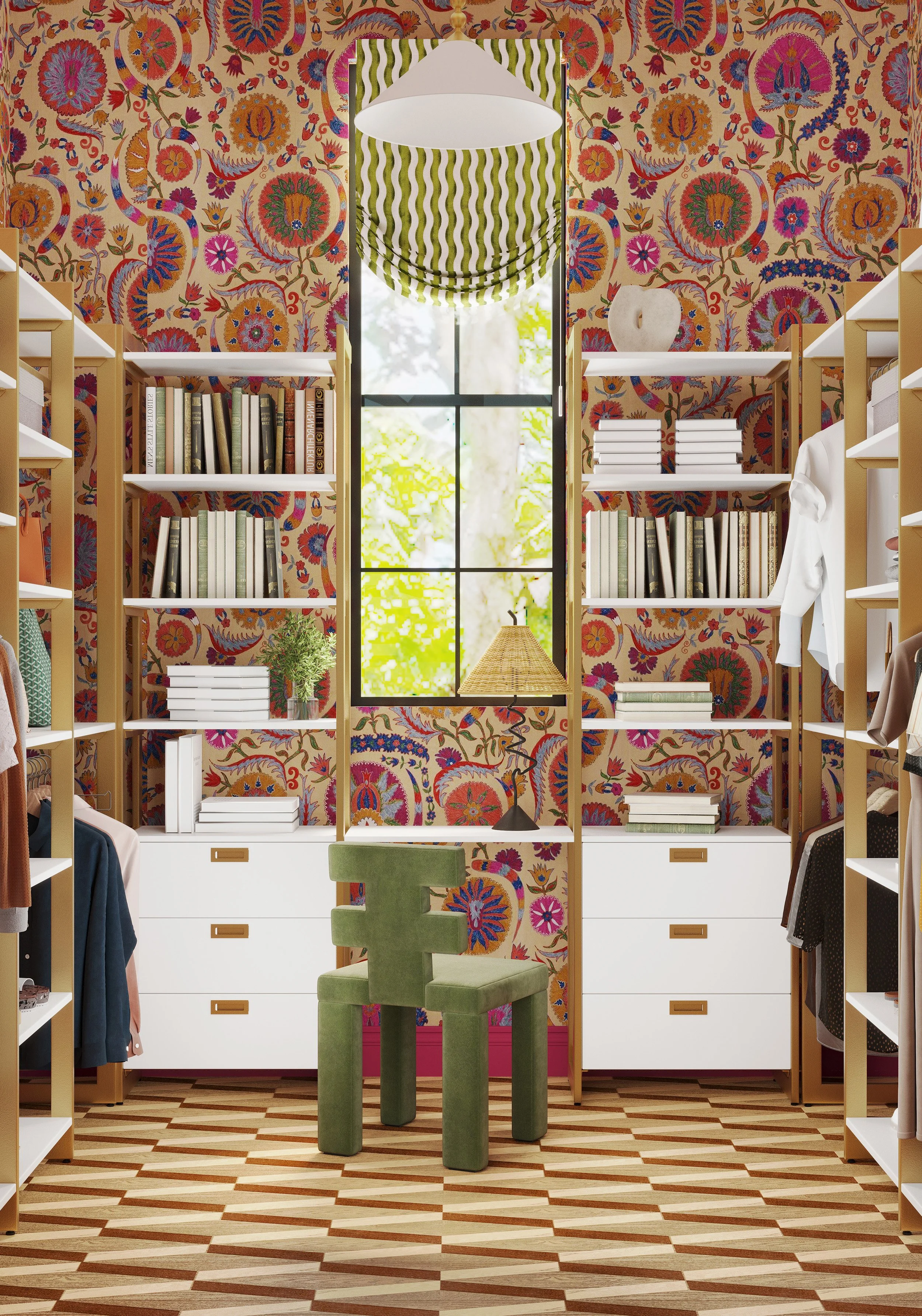 This small walk-in closet is a multi-functional space using The Everyday System California Closet. It doubles as a small office nook. We added a lively suzani wallpaper from St. Frank and matched it by painting the baseboards and ceiling in Cherry Berry from Dunn Edwards Dura. And I chose my Sang pendant to brighten up the space.