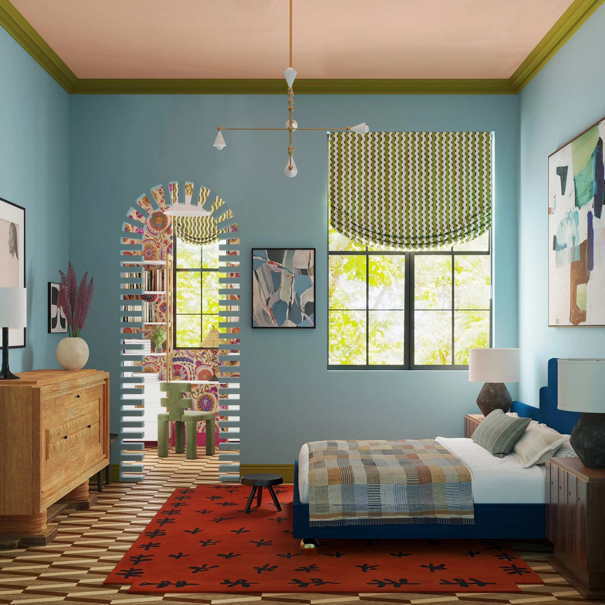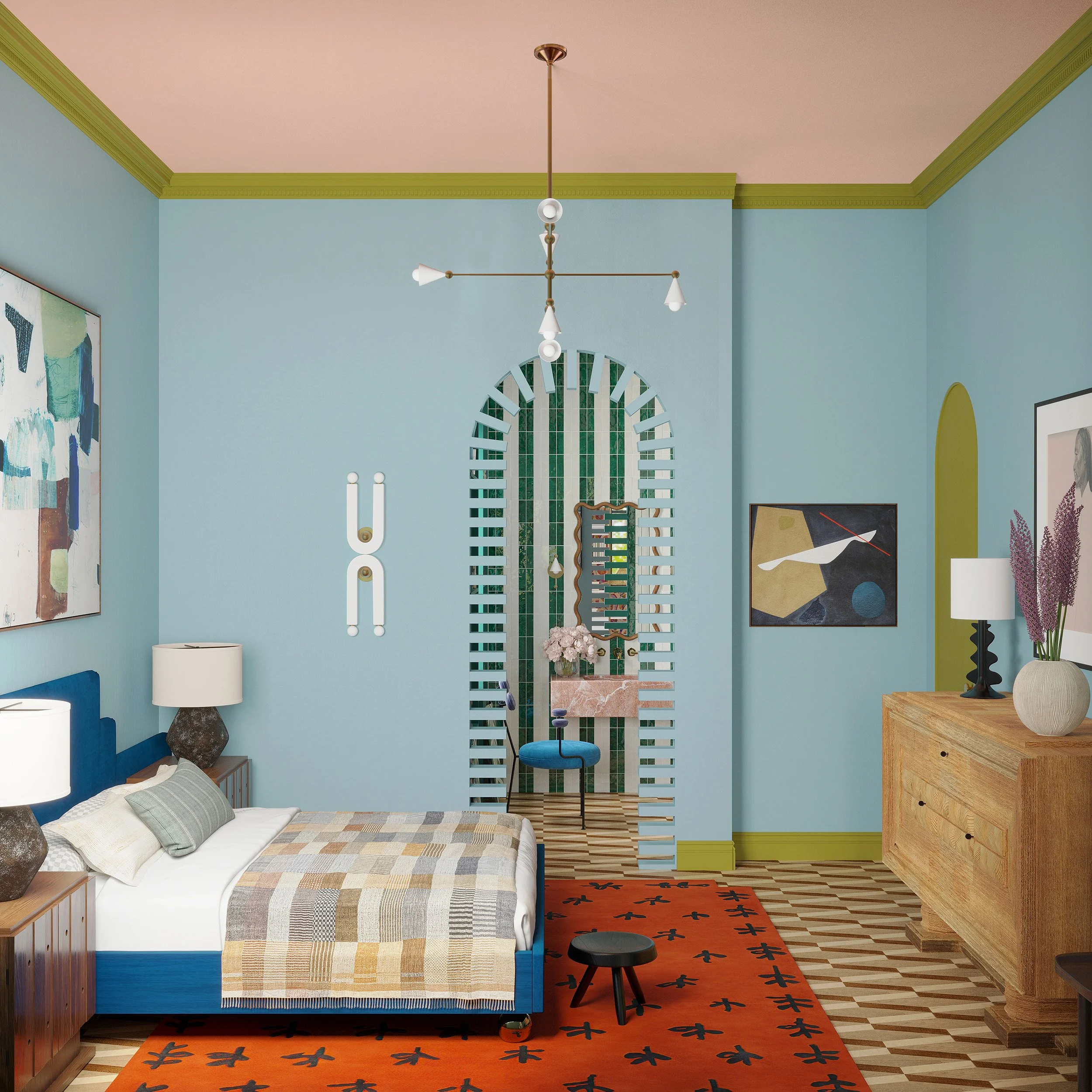 My design approach for the bedroom was to add a calming blue color Dunn Edwards Dura “Blue Spruce” which happens to be my bff, Louvain’s favorite color. We then contrasted it by painting the dentil crown molding and baseboards in “Gecko” and ceiling in “Light Carob”. Two arches open up to the closet and bathroom add architectural interest in the space. I was inspired by the multifoil arches I saw at the Royal Alcázar in Seville when I visited and wanted to put a contemporary spin on those beautiful Moorish designs. I've never done this before IRL but I imagine it's definitely DIY-able. It definitely adds a bold statement. For the hardwood floors, we went for an intricate ribbon pattern using three colors from Bruce Flooring. Hanging from the ceiling is my own Hikari chandelier.