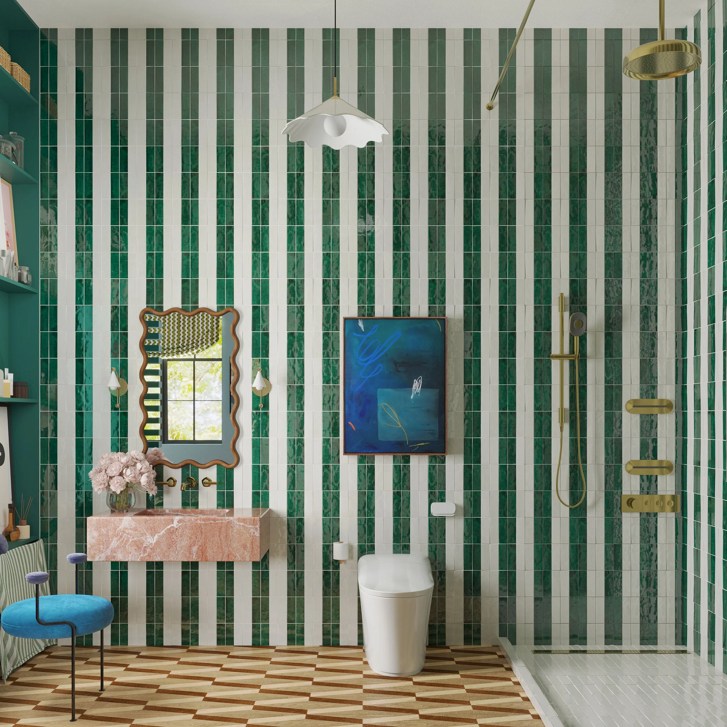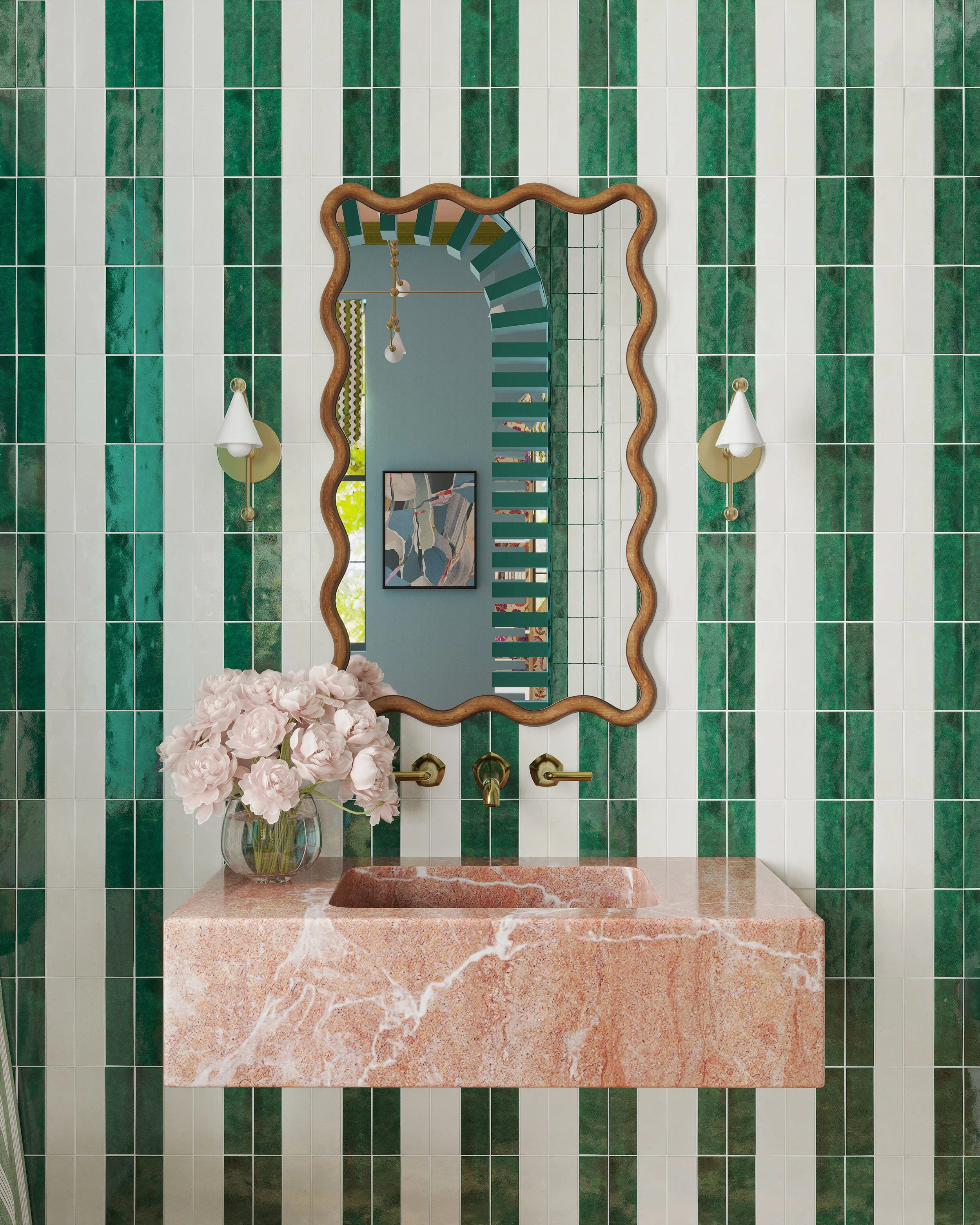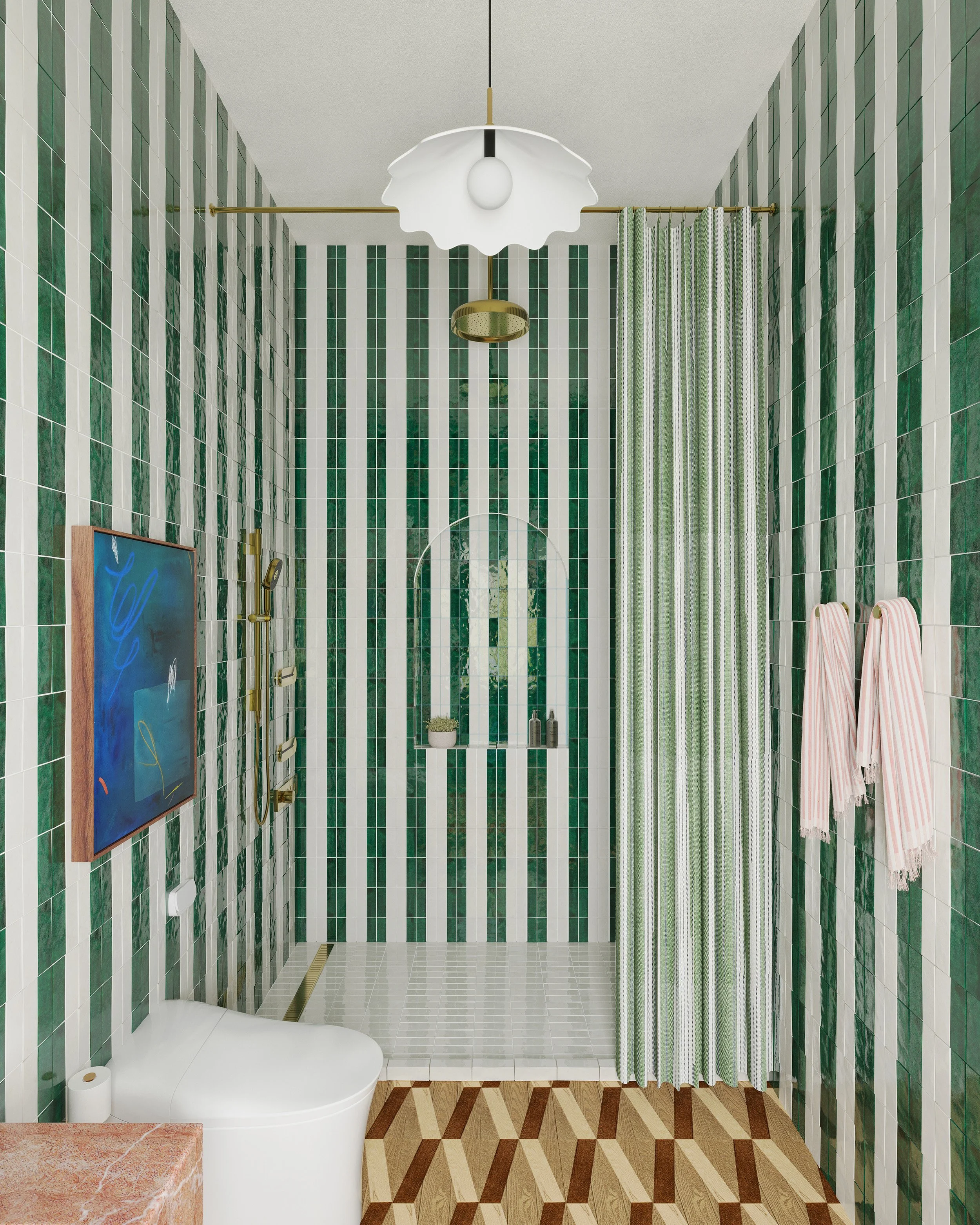 The bathroom is probably my favorite space I designed for the Living By Design Showhouse. I wanted to channel some vacay vibes and nothing says vacay quite like cabana stripes. We used Idris tiles from Ann Sacks to install a floor to ceiling striped pattern all around the room. The vertical stripes contrast perfectly with the ribbon pattern on the floors. All the brass plumbing fixtures from Kohler add warmth to this dramatic space. We have built-in shelves on one side with a small table offering abundance of storage. For lighting, I picked out my Hikari sconces for the vanity and Sodsai pendant.
