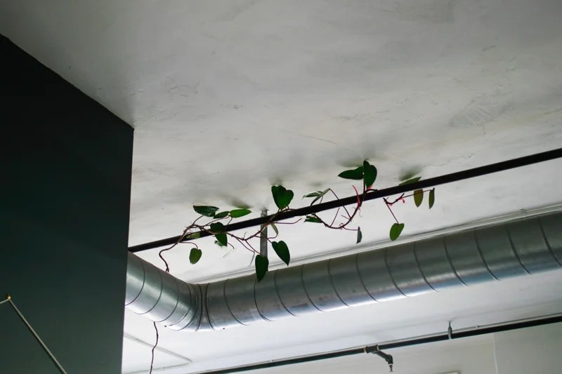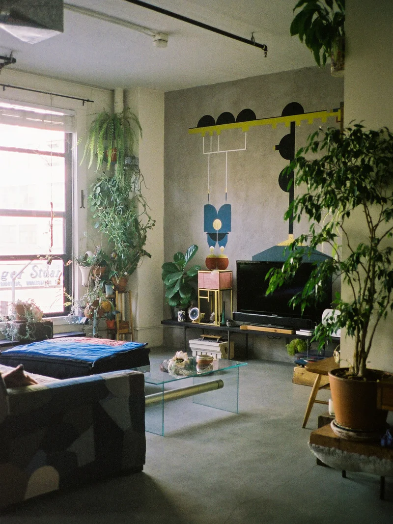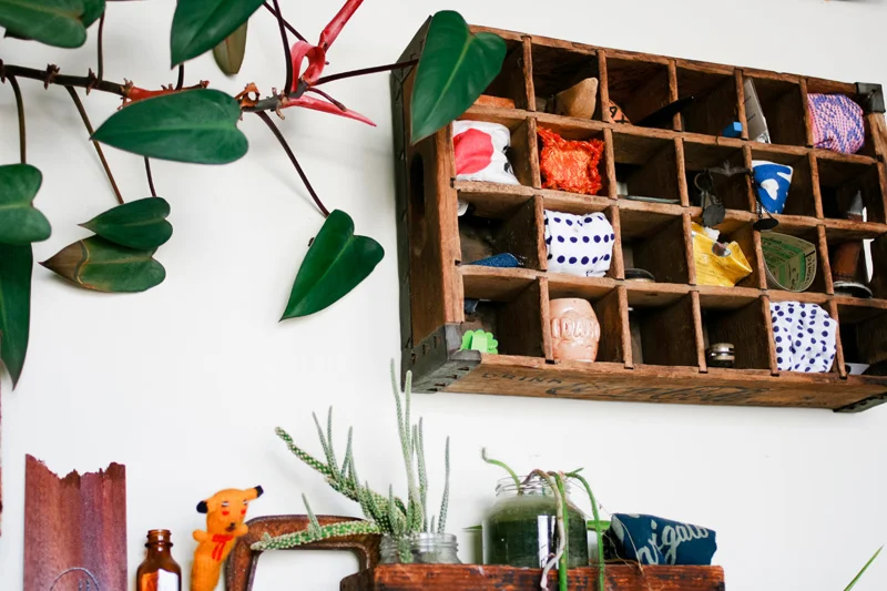 I found the glass coffee table and my workspace shelving at St. Vincent de Paul's (amazing thrift store) for $85 all together. The desk and the bench (between the "bedroom") I got at a vintage shop, and used The Brick House refinishing method. And the plants! Some I've had for years, but most are from clippings. The stacked plants in the living room are attached to a drainpipe from the roof through the apartment