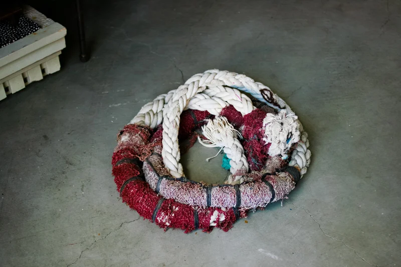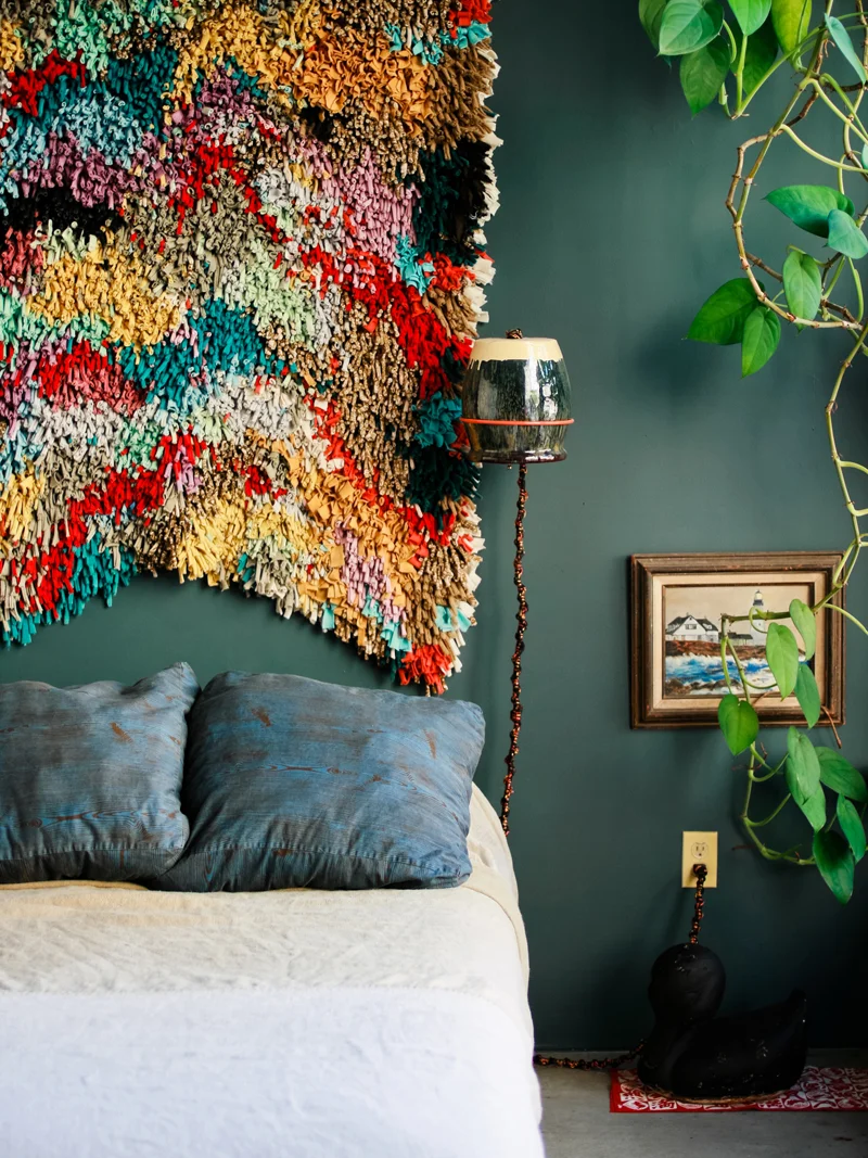 I also ended up painting the credenza and replaced the legs with wheels so I can easily roll it away for projects, or gatherings, that require more space. I originally made the hanging above the bed as a knotted fleece rug and the sconces on either side are upside-down plant pots with rope-wrapped wiring.