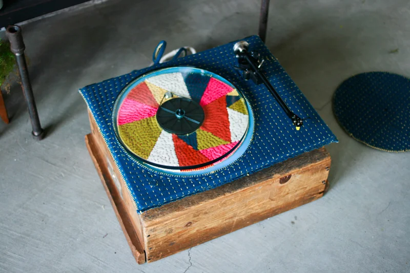 My heart is simply aching for all his DIY and upcycled projects, like his indigo patchwork sofa. It reminds me of Japanese Boro textiles from the 19th century. It's absolutely beautiful. I love that everything in his home feels like it's made with love. Every piece feels incredibly personal because Adam finds ways to add his personal touch to it, like knitting a quilt for his record player. Why didn't I think of doing that to mine? That's so good.