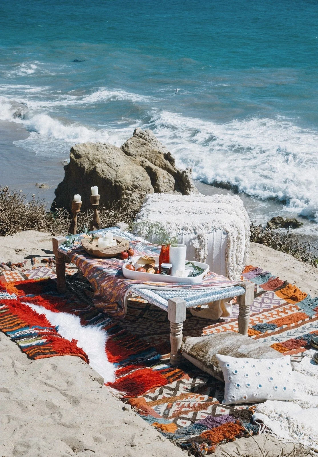 And if you want some alone time by the sea, then you can easily bring a rug, a pillow and a beach throw. A Moroccan wedding blanket can also keep you warm when you dip your toes in the ocean. Hanging out by the sea just got a whole lot fancier!